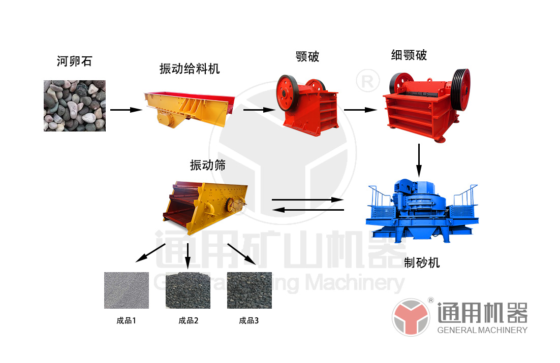河卵石經(jīng)振動(dòng)給料機(jī)均勻進(jìn)入顎式破碎機(jī)進(jìn)行一級(jí)破碎,一級(jí)破碎后的石料由皮帶輸送機(jī)送入細(xì)鄂破碎機(jī)進(jìn)行二級(jí)破碎,繼而送至制砂機(jī)進(jìn)行再次破碎,破碎后的石料送到振動(dòng)篩進(jìn)行篩分,篩分出三種0-5mm、5-20mm、20-40mm三種砂石骨料。不合格的石料還會(huì)進(jìn)入制砂機(jī)中再次循環(huán)破碎直至產(chǎn)生合格成品砂。
