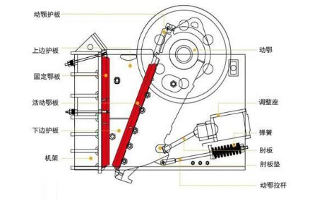 顎式破碎機(jī)的結(jié)構(gòu)主要有機(jī)架、偏心軸、大皮帶輪、飛輪、動(dòng)顎、側(cè)護(hù)板、肘板、肘板;后座、調(diào)隙螺桿、復(fù)位彈簧、固定顎板與活動(dòng)顎板等組成,其中肘板還起到保險(xiǎn)作用。