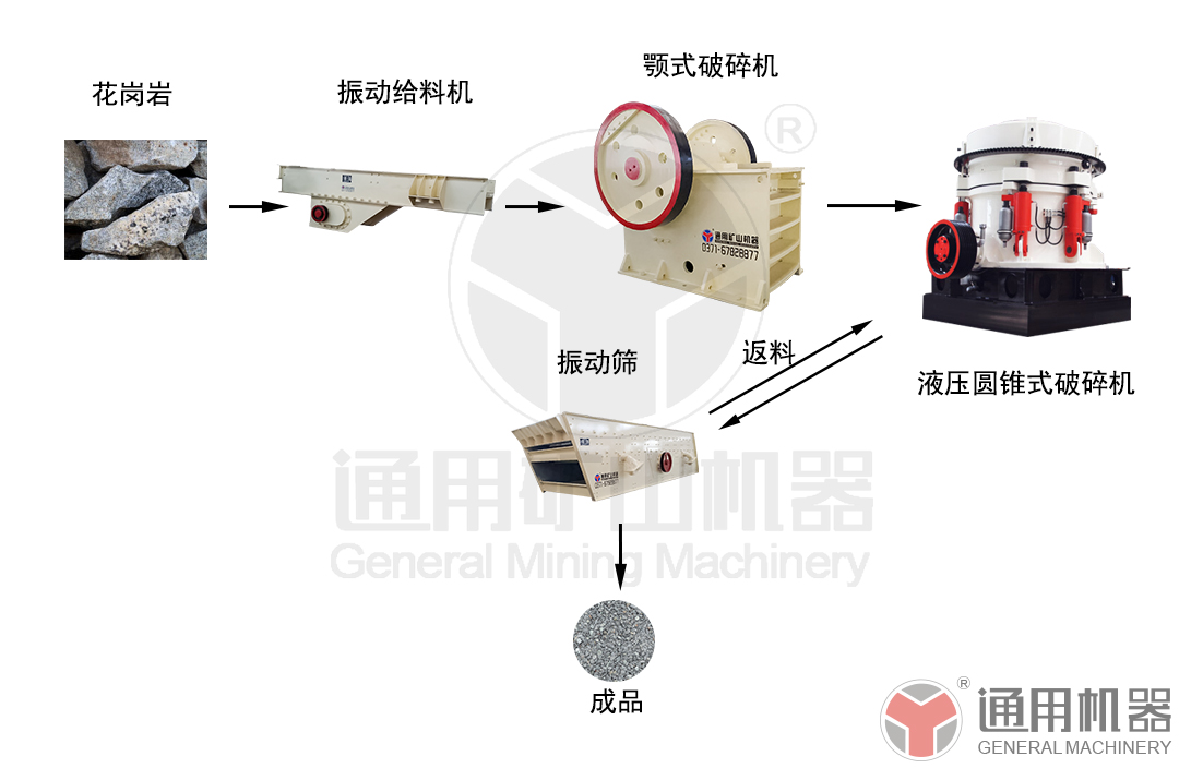 花崗巖通過振動給料機送入顎式破碎機,粗碎后,皮帶輸送機把粗碎的石料均勻送入液壓圓錐式破碎機,圓錐破對石料進行二次破碎后,通過振動篩將不合格的物料通過皮帶輸送機重新返回到液壓圓錐式破碎機中重新破碎,合格物料由皮帶輸送機輸送至成品區(qū)。